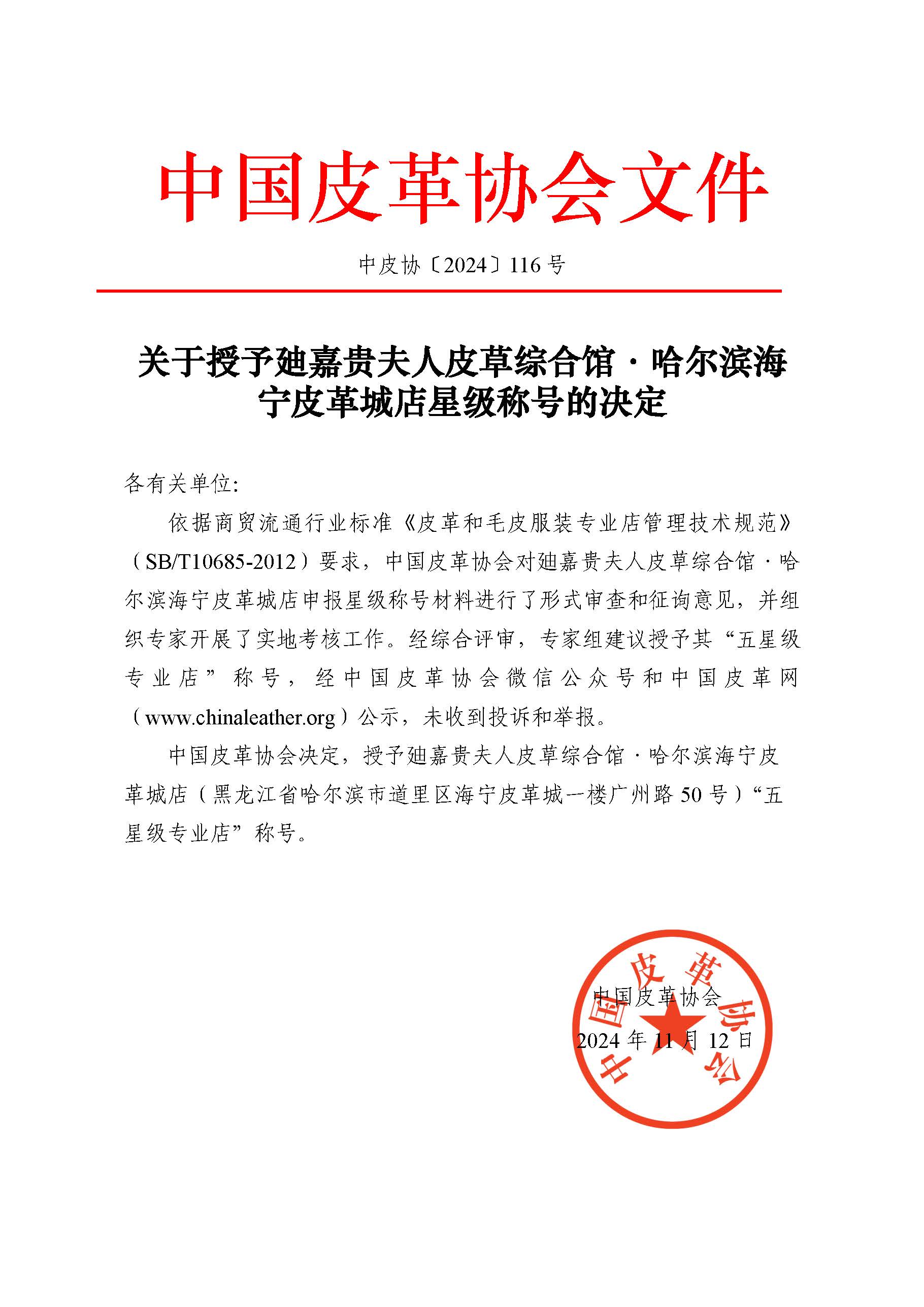 2024关于授予廸嘉贵夫人皮草综合馆·哈尔滨海宁皮革城店星级称号的决定