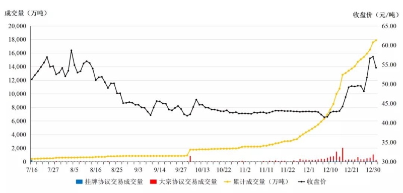 自2021年7月16日正式启动上线交易以来,全国碳市场累计运行114个交易日,碳排放配额累计成交量1.79亿吨,累计成交额76.61亿元。按履约量计,履约完成率为99.5%。12月31日收盘价54.22元/吨,较7月16日首日开盘价上涨13%,市场运行健康有序,交易价格稳中有升,促进企业减排温室气体和加快绿色低碳转型的作用初步显现。