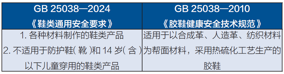 GB 25038—2024《鞋类通用安全要求》扩大了标准适用范围,适用于除防护鞋和儿童鞋以外的所有鞋品,GB 25038—2010《胶鞋健康安全技术规范》只适用于成人胶鞋,具体适用范围见表1。
