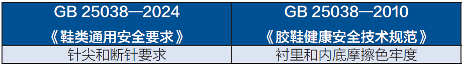 GB 25038—2024增加了鞋里的针尖和断针指标项目,衬里和内底摩擦色牢度项目将根据鞋类产品标准考核判定,具体差异见表2。