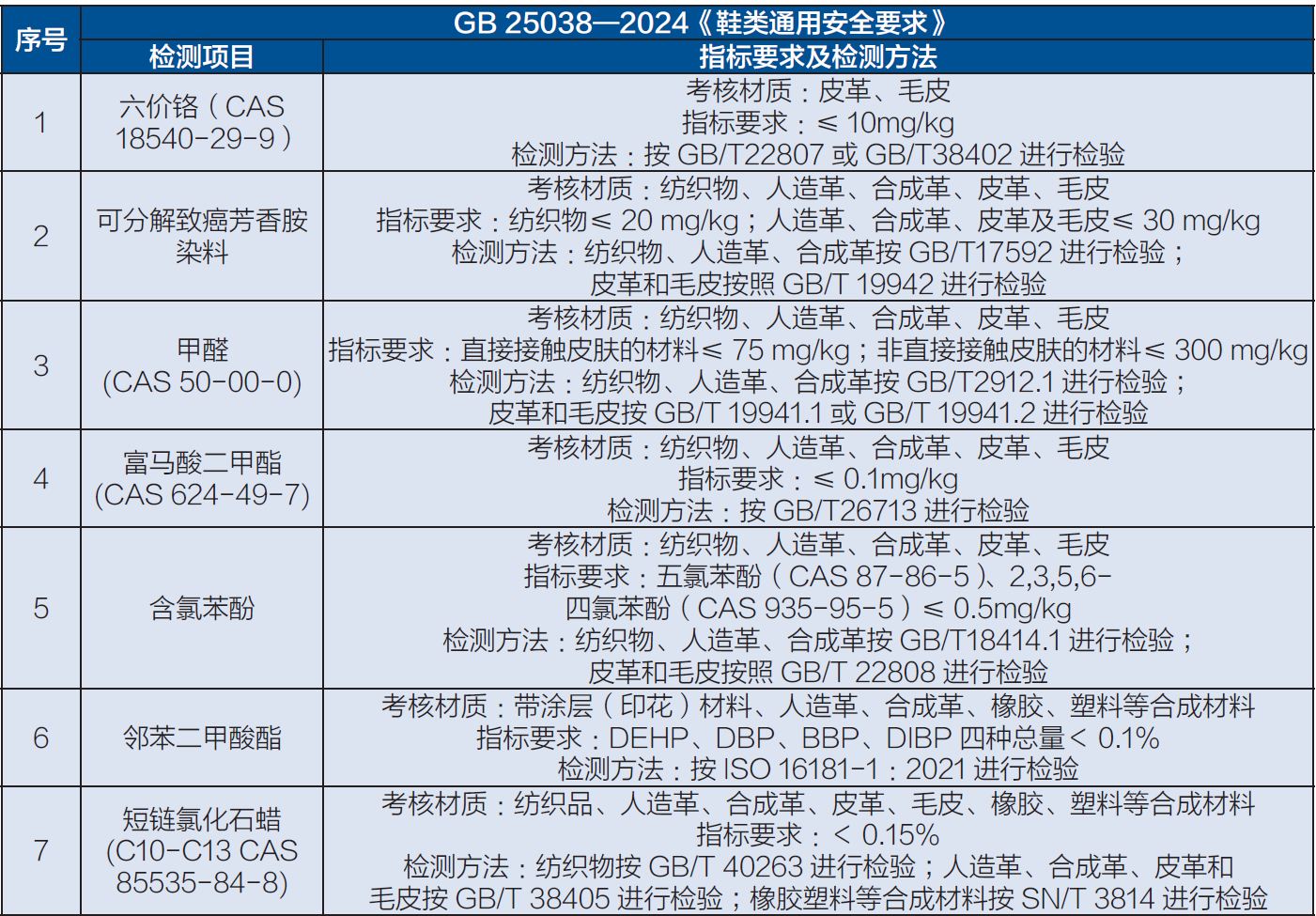 3.1增加了六价铬、富马酸二甲酯、邻苯二甲酸酯、短链氯化石蜡四种化学物质指标要求,删除了pH值、可萃取的重金属、N-亚硝基氨三个项目, 具体GB 25038—2024化学限量检测项目见表3。