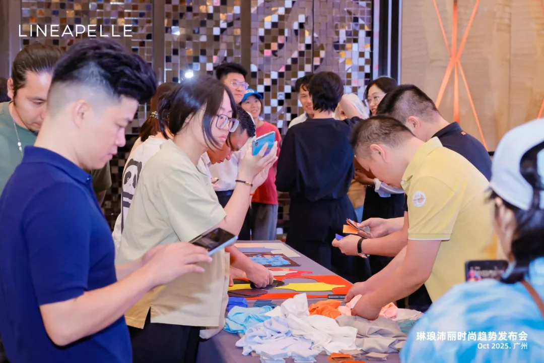 除了专业的趋势分享,发布会现场还设置了丰富的互动环节与材料展示区,新濠畔集团积极推动企业间的交流合作,助力行业资源互通。在问答环节,参会企业代表围绕皮革材质应用、工艺优化、市场趋势判断等关键问题,与 Orietta Pelizzari 及行业同仁展开深入探讨,现场氛围热烈;色彩搭配游戏互动则以轻松有趣的形式,让企业代表在实践中加深对色彩搭配的理解,为后续产品设计积累创意灵感。此外,参会企业还就琳琅佩丽展会的参展经验、设计师品牌的发展路径等热门话题交流分享,在思想碰撞中探索合作机遇。